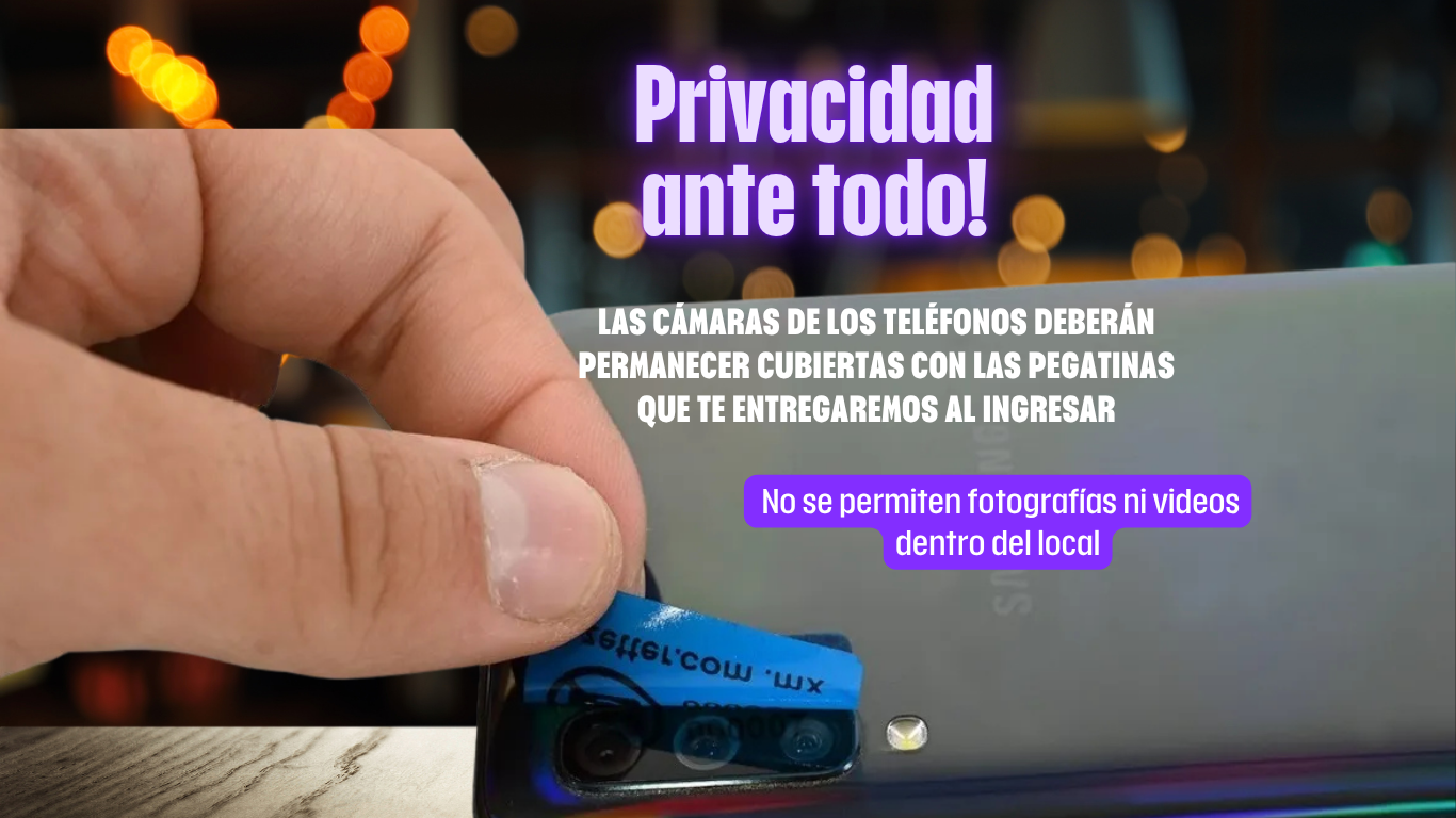 Las cámaras de los teléfonos deberán permanecer cubiertas con las pegatinas que te entregaremos al ingresar. No se permiten fotografías ni videos dentro del local..
